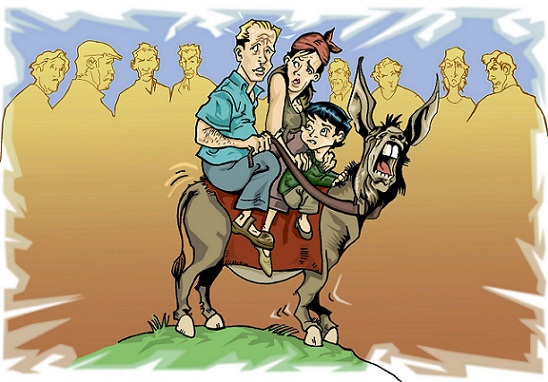 Al pasar por el tercer pueblo, la gente comentaba: “¡Pobre hombre! Después de trabajar todo el día, debe llevar a la mujer sobre el burro! ¿Y el pobre hijo? ¡Qué le espera con esa madre!”. Se pusieron de acuerdo y decidieron subir al burro los tres para comenzar nuevamente su peregrinaje.
